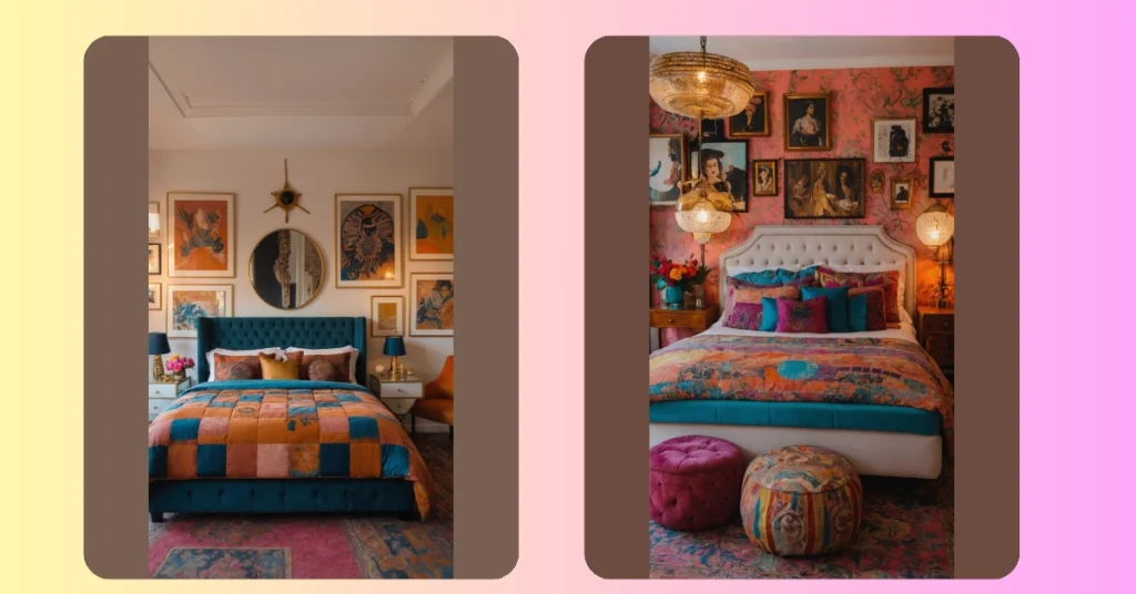 Get ready to feast your eyes because this room is basically a party where every single pattern, color, and piece of art decided to show up! This isn’t your average ‘keep it simple’ bedroom; it’s a full-on explosion of personality that screams, ‘More is more, and then some!’ Just look at that wall – it’s like a museum decided to live in a bedroom, with every frame telling its own super cool story. You could probably spend an entire afternoon just exploring all the awesome details in here!