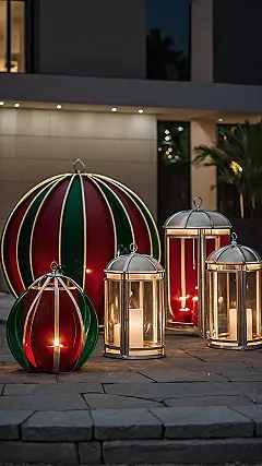 The other lanterns aren’t just standing around for moral support, either. They’re all glowing with a warm, inviting light, making even the chilliest December evening feel like a giant, soft blanket for your eyes. From the sleek silver lanterns holding their bright “candles” like tiny, glowing skyscrapers, to the smaller striped ones that look ready to roll, these outdoor lights are definitely stepping up their game. They’re basically saying, “Who needs a fireplace when your entire patio is this lit?” It’s enough to make you want to grab a mug of hot chocolate and just chill outside, even if it’s freezing!