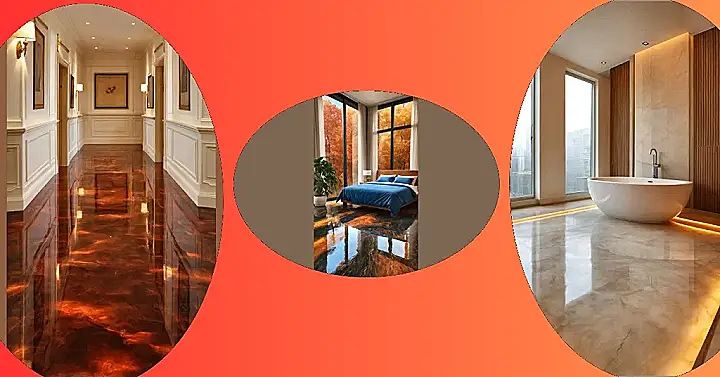 Whoa, talk about a room with a view! It’s like someone brought all the best parts of autumn right up to your window, with those amazing orange and gold trees practically posing for a selfie. But hold on, don’t just stare out – take a peek down! That floor isn’t just a floor; it’s a super cool, swirly masterpiece that totally reflects the sky and those fiery leaves. That’s the power of epoxy flooring, making your room feel like it has its own private, shimmering lake. It’s so shiny, you might even think you need a boat to cross it, but don’t worry, it’s totally solid – no unexpected swims!