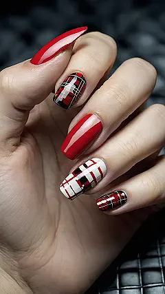 Who knew your fingertips could host such a cool fashion show? These plaid nails designs are definitely not playing it safe, mixing bold red, black, and white patterns like they’re ready for a rock concert and a cozy campfire all at once. It’s like each nail decided to dress up for a different part of the day – one’s all sophisticated in solid red, while its neighbors are having a full-blown tartan party. You might even feel compelled to start twirling a tiny imaginary baton with nails this stylish!