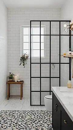 And can we just talk about that epic shower? Forget fighting with a flimsy curtain; this black-framed glass enclosure is like a VIP section for getting sparkling clean. It’s so stylish, you might start planning your next TikTok dance routine in there! Plus, check out that awesome patterned rug on the floor – it’s like a puzzle for your feet, way more interesting than just plain boring tiles. With the cozy plants and candles, this whole room screams ‘zen spa day,’ making your daily routine feel less like a chore and more like a fancy escape. Just try not to fall asleep mid-brush!