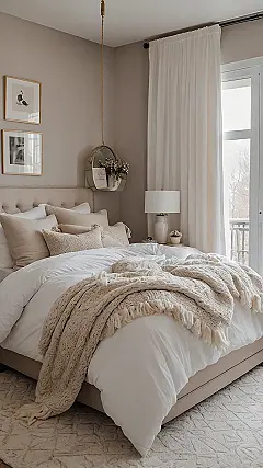 Step into this bedroom, and you might just find your body suddenly deciding that moving is entirely optional. That giant pile of fluffy pillows looks less like decoration and more like a challenge to see how many layers of comfort you can sink into before you disappear completely. And that massive, chunky blanket? It basically looks like a warm, soft hug knitted by a friendly giant who really understands the importance of being ridiculously cozy. You could probably roll yourself up in it like a human burrito and achieve peak chill levels without a single worry about anything on your to-do list.