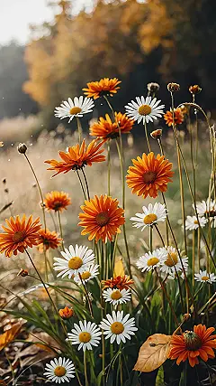 These cheerful flowers are basically throwing a party, aren’t they? With their bright orange petals and happy white daisies, they’re practically shouting “Hello, gorgeous autumn!” The soft, blurred fall colors in the background just make it extra cozy, like your phone screen is snuggling up in a warm blanket. Let’s be real, your current wallpaper is probably a blurry selfie from last year, so it’s definitely time for an upgrade that says “I love pumpkin spice and everything nice!”