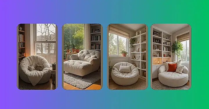 This isn’t just a chair; it’s a fluffy, white cloud daring you to sink in and never leave. One look at that giant, marshmallow-like seat and soft blanket, and you just know you’ve found the ultimate escape pod. It’s the kind of spot where you can dive headfirst into a thrilling new novel, completely forget about your chores, and maybe even lose track of what day it is. With a bookshelf stacked high with amazing stories right beside it, this cozy corner is practically shouting, “Hey, bookworm, your perfect reading nook is calling!”