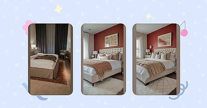 Wow, talk about a comfy zone! This bedroom is practically begging you to ditch your homework and dive right into that cloud of pillows. That rich, red accent wall isn’t just a color; it’s a whole mood – like a fancy date night decided to move into your room. With that super fluffy throw blanket draped over the pristine white sheets, it looks so inviting you might accidentally nap for a week. This space definitely nails the “romantic bedroom” vibe, making it perfect for dreaming big, or just really, really long, cozy snoozes.