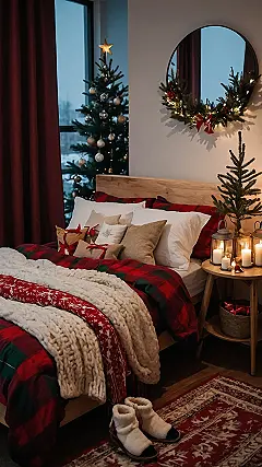 Forget about chilly winter mornings when you have a bed this cozy, practically a professional snuggling station! That big, vibrant red plaid blanket isn’t just for show; it’s your personal fortress against the cold, perfect for wrapping up tighter than a holiday gift. With the soft glow from the candles and twinkling lights reflecting off the window’s snowy view, you’ll probably spend more time ‘researching’ the optimal napping position than actually getting out of bed. This kind of Christmas bedroom decor just screams ‘stay in and watch holiday movies all day’ – and honestly, who are we to argue?
