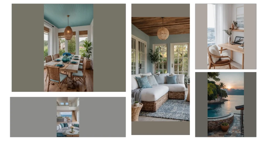 Walking into this dining room, you might do a double-take to make sure you didn’t accidentally sprout gills, because that ceiling is such a dreamy blue, it practically screams ‘underwater adventure’! It’s like someone said, ‘Let’s bring the calm lake sky indoors, but without the risk of a rogue seagull stealing your toast.’ The whole vibe, with the chunky wooden table and those super cool woven chairs (complete with comfy blue cushions, naturally), makes you want to kick back and pretend school doesn’t exist for a while.