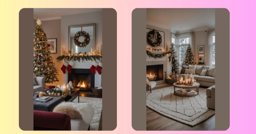 Step right into a scene so cozy, it practically screams, ‘Grab a blanket and some hot cocoa!’ This Christmas living room isn’t just decorated; it’s practically giving off warm hugs thanks to these awesome lanterns on the mantelpiece. They’re like little glowing apartment buildings for candles, each one shining a friendly, flickering light that could probably melt even the iciest winter blues. Seriously, these aren’t just decorations; they’re tiny mood-setters that make every evening feel like the start of a holiday movie marathon, complete with all the comfy vibes.