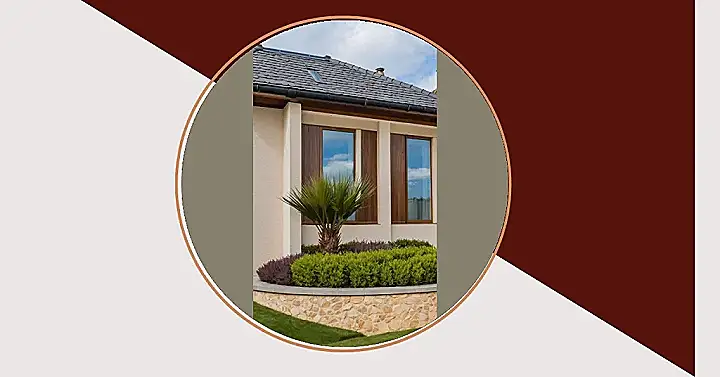Stepping up to this house, you might actually wonder if you accidentally booked a trip to a fancy resort instead of just visiting a friend’s place! This front garden landscape is seriously showing off, with its perfectly manicured lawn looking like a giant green carpet you’re almost afraid to step on. Right there, front and center, is that spiky little palm tree, probably whispering secrets about its tropical ambitions to the neatly trimmed bushes. It’s got that main character energy, standing proud in its stone-walled VIP section, reflecting the blue sky from the windows like it’s posing for a selfie.