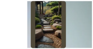 And check out that super-long wooden bench! It’s perfect for spreading out all your sketchbooks, or, let’s be real, an epic mountain of snacks for movie night under the stars (or, well, under the ceiling opening). Those cool, uneven stepping stones over the dark pebbles, mixed with little bursts of green plants, make it feel like an adventure just walking from one end to the other. With extra comfy chairs by the fire for deep chats and a big open door leading to even more greenery outside, it’s basically the ultimate spot for a blend of chill vibes and a touch of fancy French garden living.