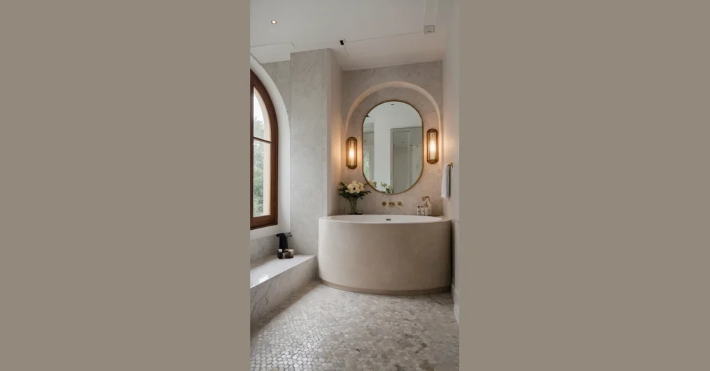 Take a peek at that round tub in the picture – it practically screams, ‘Come on in, the water’s fine!’ And let’s not forget the incredible glow from those wall lights, perfectly framing the mirror. You won’t have to worry about looking like you just rolled out of bed with lighting this good; it’s basically built-in glamour! Even the floor, with its cool, pebble-like tiles, looks like it gives your feet a mini-massage. Who needs a boring old bathroom when you can have one that makes every morning feel like you’re getting ready for a red carpet event, even if you’re just heading to school?