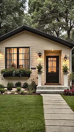 This place totally looks like it jumped straight out of a fancy design magazine, doesn’t it? With those sleek black windows and doors, and the glowing lights making it feel super cozy, you almost expect a movie star to casually walk out. But here’s the kicker: this gorgeous pad might actually be what people call a ‘tiny house’! Forget those shoebox-on-wheels stereotypes; this one clearly got the memo about looking fabulous even if it’s not a sprawling estate. You can practically hear it whispering, “Yes, I’m compact, but I’m also rocking this whole modern chic vibe, and my plants are thriving.”