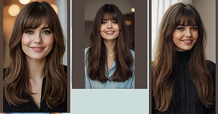 These aren’t just any bangs; they’re the kind that elegantly part down the middle, like a velvet curtain opening for a show-stopping performance (which is your face, obviously!). They work like magic with long hair, just like our smiling friend here shows off, adding a touch of effortless cool without feeling too heavy or in-your-face. Plus, if you ever decide you want to switch up your look, they grow out super gracefully, blending into your layers without that awkward ‘half-bangs, half-forehead’ phase. It’s basically the hairstyle equivalent of having your cake and eating it too, looking fabulous the whole time!