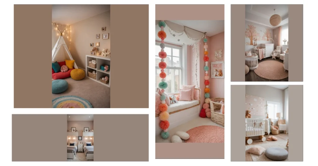 Step inside this room and prepare for a full-on cuteness attack. It’s like a giant fluffy marshmallow exploded in the best way possible, all set up for a tiny human who probably thinks ceiling fans are the most exciting thing ever. Look at those hanging pom-poms and beads – they look like giant happy candies! Someone went all out making this spot the ultimate cozy nest, filled with soft pillows and shades of pink that would make a flamingo jealous. It’s definitely the kind of room where even the dust bunnies probably wear tiny crowns.