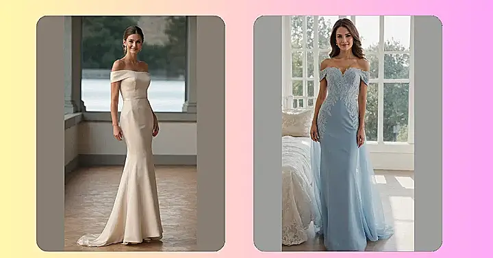Let’s be real, a wedding day for a mom is like an Olympic event: there’s the emotional crying during the vows, the strategic snacking before dinner, and then the epic dance-off with your kids or your sister. A dress like this isn’t just about looking good; it’s about feeling unstoppable. That off-the-shoulder look and elegant fit will make any mom feel like she just stepped off a runway, ready to celebrate, mingle, and maybe even give a tear-jerking toast without a single wrinkle in her perfect outfit. Just remember to save some energy for helping pack up all the leftover cake!