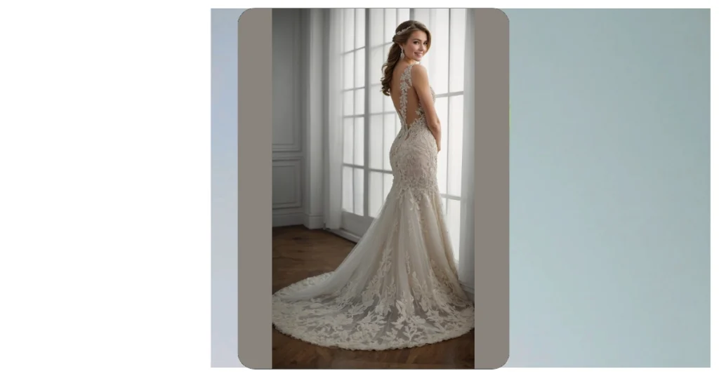 And that back! It’s not just a dress, it’s a whole art project, with lace patterns so detailed you might spend hours just admiring them. Someone definitely spent ages attaching all those tiny beads and creating that beautiful open-back design, which is probably fancier than most people’s entire outfits for a formal dance. Just imagine trying to sit down gracefully in that flowing skirt – you’d probably need a team of tiny squirrels to arrange it just right! But hey, for a day where you’re the main event and shining brighter than a disco ball, it’s totally worth feeling like royalty.