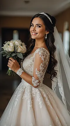 Look at that amazing hair! This isn’t just any hair; this is straight-up glam bridal hair goals right here. With those perfect waves and that sparkly crown chilling on top, she looks like she’s about to walk down the aisle or maybe just grace the cover of a magazine. It’s the kind of hair that makes you do a double-take and wonder how it stays that flawless while still looking so effortless and bouncy. Seriously, she looks ready to totally slay her big day!