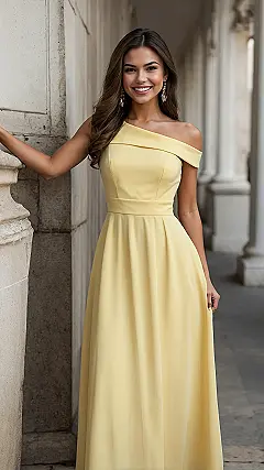Stepping out in a butter yellow dress is basically a superpower that makes everyone around you instantly happier. Seriously, this dress isn’t just an outfit; it’s a mood enhancer wrapped in fabric, brighter than your crush’s future. The one-shoulder style in the picture adds that extra dash of “I’m fabulous and I know it” without even trying too hard. It’s the kind of dress that makes you feel like you just main-character’d your way into a rom-com, ready to spread sunshine and maybe get asked for fashion advice.