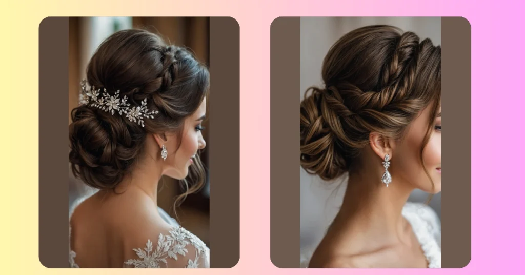 Getting ready for a wedding as a bridesmaid means looking totally fabulous, but also being ready for anything – like chasing a runaway flower girl or dramatically catching the bouquet. This gorgeous updo, with its fancy braids artfully woven into a stylish bun, is basically your hair’s superhero costume for the big day! It keeps every strand perfectly in place, so you can dance like nobody’s watching without ending up with hair stuck to your lip gloss, all while showing off those sparkly earrings.