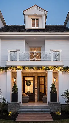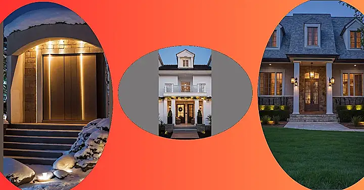 The house in this picture looks like it’s ready to host the coolest December party or at least win the neighborhood light-decorating contest, hands down! Those sparkling lights on the tall trees aren’t just pretty; they’re practically screaming, “Welcome, brave souls, to our cozy abode where hot cocoa flows freely!” With all those fancy outdoor lanterns and the clever little pathway lights, you definitely wouldn’t trip on your way to the door, even if you were trying to sneak back in after curfew. It’s the kind of entrance that makes even the grumpiest grinch crack a tiny smile and maybe even wonder if they left their own porch light on.