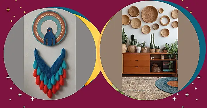 And just below our mysterious friend, there’s a fluffy, fantastic explosion of color that’s practically begging for a high-five. This isn’t your grandma’s macramé; it’s a vibrant, blue, fuzzy masterpiece with a whole bunch of playful turquoise and fiery orange tassels hanging down like the happiest rain shower ever. It brings all the texture and fun, making your wall feel super cozy and exciting at the same time. Together, these pieces are like the dynamic duo of room wall decor, ready to turn any boring wall into the coolest hangout spot in town – no complicated instructions or secret decoder rings needed!