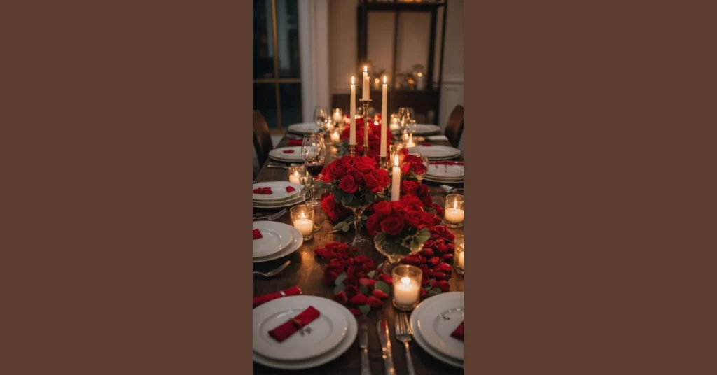 Feeling fancy tonight? This dinner table totally screams ‘special occasion’ louder than your alarm on a Monday morning! Look at those flickering candles – they’re not just for light, they’re basically tiny mood generators, making everything glow with a warm, cozy vibe. It’s like someone decided to turn down the harsh overhead lights and declare, “Tonight, we dine like royalty, but, like, super chill royalty!” All those red and pink roses, scattered petals, and even a single rose on each plate just take the effort level from ‘zero’ to ‘hero’ in seconds.