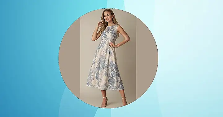 This gorgeous midi dress, with its vibrant blue flowers popping against a creamy background, looks like it just stepped out of a fancy garden party – but way more fun! It hits that perfect “not too long, not too short” spot, making it ideal for when you want to look super put-together without the drama of constantly tugging at your hemline. You can definitely show off your killer shoes, like the ones in the picture, without having to worry about tripping over your skirt during an impromptu dance-off or a mad dash for the last slice of pizza.