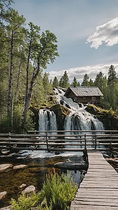 Look at this cool place! It’s basically a wooden cabin parked next to a giant waterfall in Finland. Imagine trying to have a quiet cup of hot cocoa on that porch; you’d probably need earplugs and a raincoat! It looks totally epic though, like something straight out of a movie where someone is about to go on a grand adventure or just really likes the sound of rushing water 24/7. It’s definitely the kind of scene that makes you pause and think, “Wow, nature really said ‘go big or go home’ here.”
