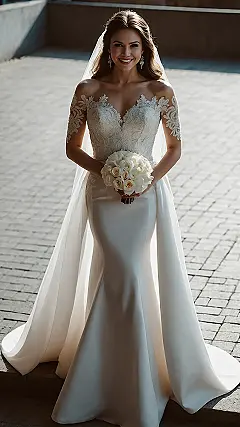 Just look at this stunning fit and flare wedding dress! It’s like it knows you want to look absolutely incredible without feeling like you’re stuck in a fancy, human-sized tea cozy. The way the lace hugs the top part, with those elegant long sleeves and high neck, says “I’m sophisticated and graceful,” but also, “I definitely haven’t tripped yet.” The delicate patterns and that happy smile just scream confidence, making you look like you’re ready for your big moment, and maybe even a red carpet appearance afterwards.