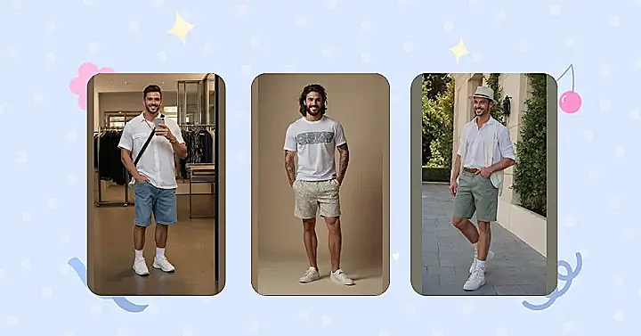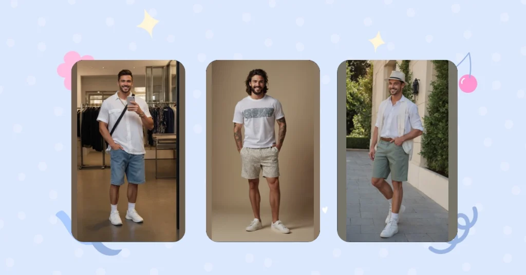 When the sun’s out and your legs have been doing all the heavy lifting (or just existing awesomely), what better way to celebrate than with a fantastic pair of men’s shorts? Forget about being trapped in long pants; these shorts, like the ones our buddy here is rocking, are all about letting your knees catch some rays and your style shine. Plus, who needs complicated fashion rules when you can look this effortlessly cool just by choosing the right pair to conquer your day, whether it’s an epic ice cream run or just chilling?