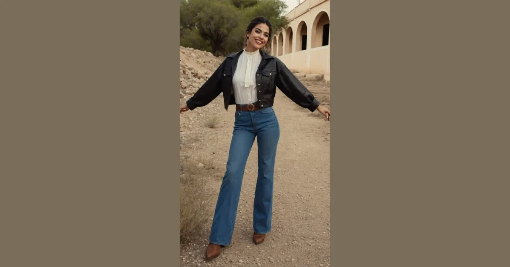 Talk about stepping out in style! This outfit is basically saying, “Yeah, I look this good, and I might just go wrangle some wild horses… or maybe just grab a really good smoothie.” She’s absolutely crushing the Mexican rancho vibe with that sharp black leather jacket and those perfectly flared jeans. It’s a look that screams confidence and a little bit of “don’t mess with my fashion sense,” all while flashing that super friendly smile. Who knew looking ready for a dusty adventure could be this effortlessly chic?