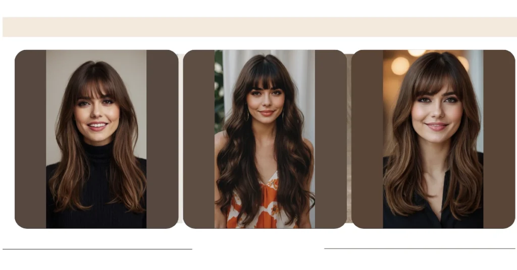 These aren’t just any bangs; they’re the kind that elegantly part down the middle, like a velvet curtain opening for a show-stopping performance (which is your face, obviously!). They work like magic with long hair, just like our smiling friend here shows off, adding a touch of effortless cool without feeling too heavy or in-your-face. Plus, if you ever decide you want to switch up your look, they grow out super gracefully, blending into your layers without that awkward ‘half-bangs, half-forehead’ phase. It’s basically the hairstyle equivalent of having your cake and eating it too, looking fabulous the whole time!