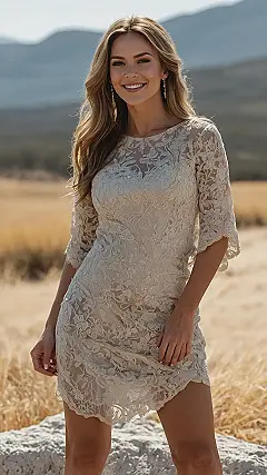 Who needs a boring old tee when you can rock a mini dress that’s this fabulous? This lacey beauty, sparkling brighter than your phone screen in the midday sun, looks ready for anything from a casual field photoshoot to an impromptu dance party. It’s got that cool ‘I woke up like this, but totally fancy’ vibe, making even a dusty landscape look like a runway. And with those comfy sleeves, you won’t be freezing when the sun dips, or sweating through your favorite shirt trying to look cute!