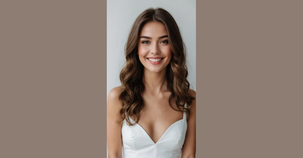The best part about these soft, flowy waves is they practically glow with good vibes, making you look ready for anything without a fuss. They frame her face perfectly, highlighting those awesome dimples and that sparkling smile, making her seem like the kind of person who’s always up for a fun adventure. It’s the perfect blend of classy and chill, proving that sometimes, the most stunning looks are the ones that feel totally natural and easy-breezy.