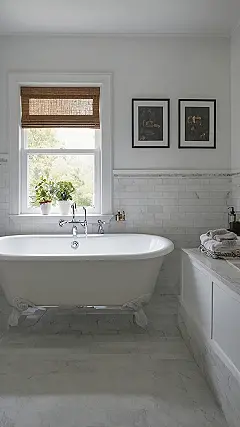And check out those details! The shiny white tiles and fancy marble floor aren’t just for looking good; they make the whole place feel super fresh and clean, like a fancy spa you’d see in a movie. Even the simple things, like the cool wooden blinds and those neat framed pictures, really pull the whole vibe together, making it way more inviting than your average shower stall. This isn’t just a bathroom; it’s proof that a good remodel can transform a basic space into your personal zen zone, ready to wash away all the day’s weirdness. You might even start volunteering for bath time!