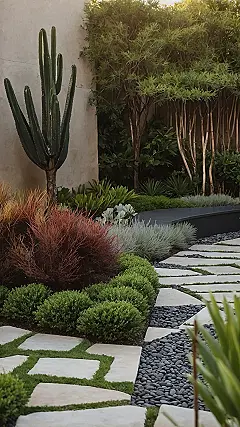 This garden is seriously living its best life, isn’t it? You’ve got the towering cactus looking like the chill elder statesman, surrounded by a riot of textures and colors – from the spiky red bushes doing their own thing to the neatly trimmed green balls showing off their perfect haircuts. It’s like a perfectly curated plant party where every guest knows exactly where to stand for the best photo op! What makes it all look so good and organized, even with such diverse plant personalities, is how they’re all given their own special space to shine. This clever design lets each leafy friend thrive without stepping on anyone else’s roots.