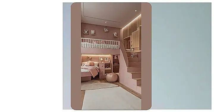 Check out this room! Forget your standard twin bed; this is like the VIP suite of kids’ bedrooms. That bunk bed isn’t just for sleeping; it looks more like a cloud built for royalty who also happen to own a top-tier collection of incredibly soft stuffed animals. See that giant fluffy puff on the floor? It’s basically a personal relaxation cloud, perfect for plotting world domination or just melting into after a long day of… well, being a kid in a super luxurious room. This place definitely screams “fancy pants,” but in the most comfy, pink-hued way possible.