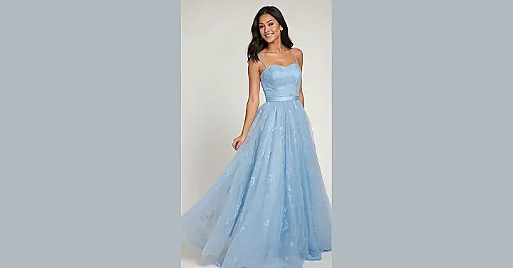 This gorgeous blue gown is practically begging for a grand entrance, isn’t it? It’s got that totally floaty, airy vibe that makes you feel like you could glide into any fancy evening event and instantly become the most enchanting person in the room. The delicate floral patterns scattered across the skirt are like tiny, elegant whispers, adding just the right amount of sparkle without screaming for attention – perfect for snagging compliments while you casually pretend you didn’t spend hours getting ready.