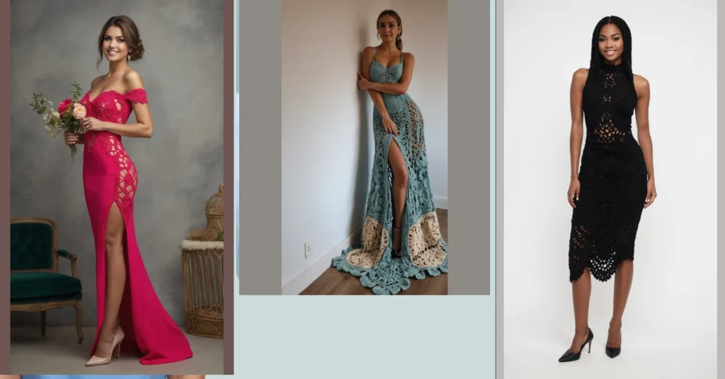 Forget everything you thought about crochet being just for those cozy blankets your grandma might make! This crochet-inspired dress is here to totally prove that yarn can be seriously stylish and fashion-forward. Just look at this masterpiece – it’s got all the intricate, lacy vibes, but in a totally chic, off-the-shoulder gown that perfectly hugs every curve. The model looks absolutely stunning and happy, smiling like she knows she’s rocking something truly unique that probably took some serious handiwork, and definitely isn’t just for covering up dusty furniture.