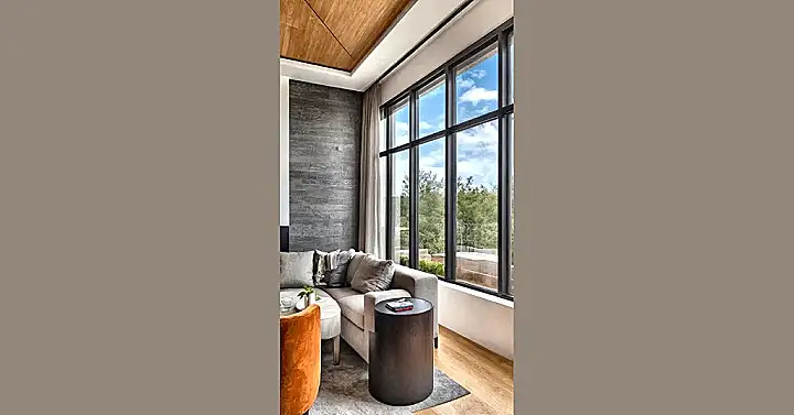 You know those times when you see a room and think, “Yup, I could definitely spend all my screen time here, no complaints”? This picture basically screams “Netflix marathon approved” with a side of “fancy architectural digest photoshoot.” It’s like they bottled up all the good vibes from the outside (hello, giant windows showing off all that green and blue!) and poured them right into the decor. Who needs a nature documentary when your living room is practically a front-row seat to the forest, complete with stylish gray walls that look like they’re trying to be fancy rock formations?