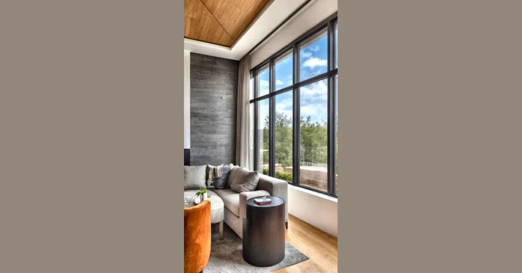 And let’s talk about those comfy-looking sofas – they practically invite you to sink in with a good book (or, let’s be real, your phone). The genius of home decorating here is how they mix textures, from that soft-looking couch to the cool wooden ceiling and floor, and even that little pop of orange from the chair that’s probably just waiting for someone to spill juice on it. See those side tables? One’s got a plant looking all zen, the other has books pretending someone’s actually reading them. It just goes to show that decorating your home isn’t just about putting stuff anywhere; it’s about making a space that feels like *you*, even if “you” mostly involves finding the perfect spot for your snacks and a super cozy blanket.