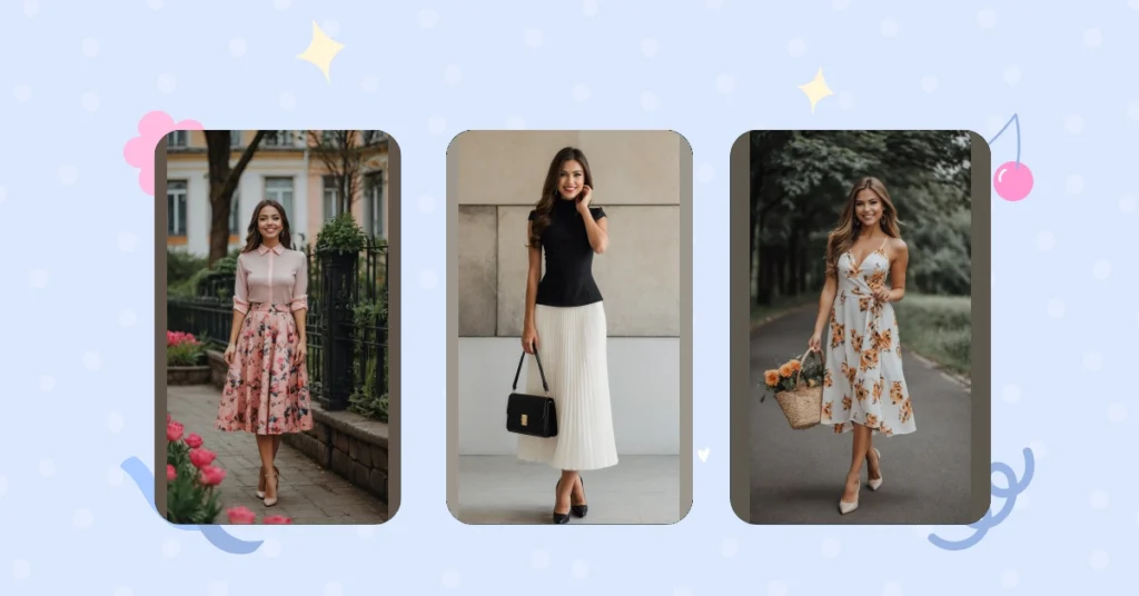 This fantastic outfit, with its gorgeous floral skirt and perfectly coordinated pink top, definitely makes us think of spring days and sunny adventures. That beaming smile makes it look like she’s about to surprise everyone with the fanciest picnic ever – perhaps one with actual linen napkins and tiny cucumber sandwiches! We just hope her actual picnic spot has solid ground, because those chic heels might have a bit of a tricky time navigating a grassy park. Forget the red ants; we’re more concerned about sinking gracefully into the lawn.