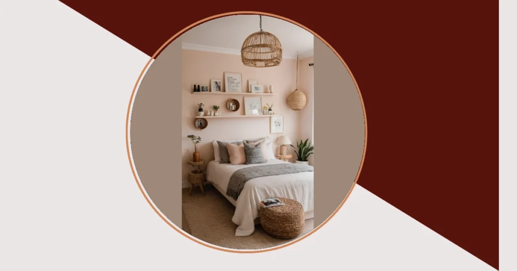 Look at how everything just *works* together, even in this perfectly sized space. From that awesome woven light fixture that looks like a giant, super chill dreamcatcher, to the neat little shelf above the bed with all the cool art. It’s like this room silently whispers, “I’ve got my life together… mostly.” Even the simple macrame hanging adds that extra cool factor without trying too hard. This bedroom proves that a personal space can have major style points, making it the perfect spot to recharge before you face the world (or just your next class).