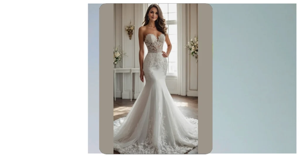 This white wedding dress totally proves that some outfits are just made for the spotlight – and for epic mirror selfies! You can tell it’s a “trumpet” style because it hugs the body super close, almost like a mermaid tail, before suddenly flaring out in a big, dramatic way around the knees. Our bride-to-be is clearly feeling herself, flashing a huge smile that says, “Yep, this is the one!” while snapping that perfect pre-wedding pic.