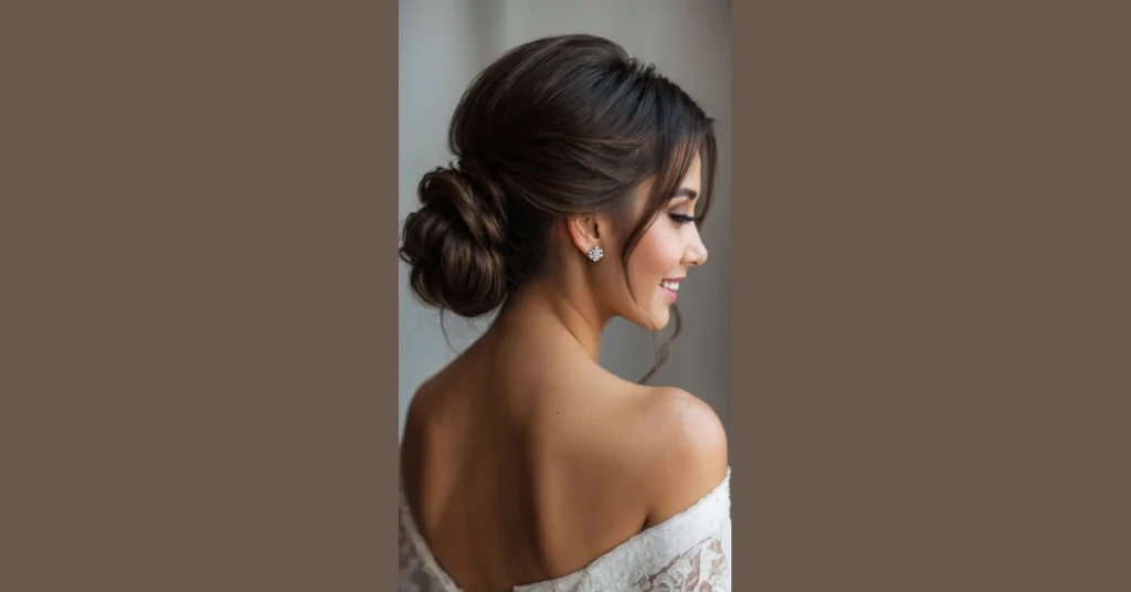 This isn’t just a pretty bun; it’s a smart bun! Picture trying to bust out your best dance moves at the reception, or leaning in for a hug, without feeling like your hair is about to stage a dramatic escape. A sleek, simple bun like the one in the picture means you can focus on enjoying every moment, showing off those lovely dress details, and maybe even eating your cake without getting hair in it. It’s the perfect blend of classy and carefree, ensuring your head is light and your spirits are high.