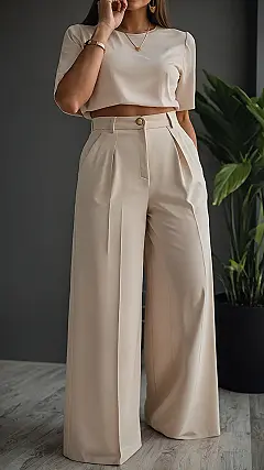 Pairing those magnificent wide-leg trousers with a sleek top like this beige beauty is pure genius. The little cutout detail adds a touch of ‘I’m sophisticated but still fun’ energy, making you look instantly put-together without even trying too hard. It’s like these trousers are saying, ‘Don’t worry, I’ve got your back (and your legs!) – just add a cool top and you’re ready to charm the entire universe.’ You’ll be walking around feeling like you just stepped off a runway, ready for whatever life (or your next class) throws at you, all while being secretly super cozy. Total win!