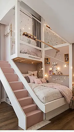 And check out those stairs! They aren’t just steps; they’re like soft, pink mountains leading to who knows where – probably somewhere equally awesome, like a hidden reading spot or a candy stash. This bedroom isn’t messing around; it’s got built-in fun and comfort everywhere you look, making your friends seriously jealous of your sleepover palace. It’s the kind of luxury where you feel totally pampered just chilling in your own space.