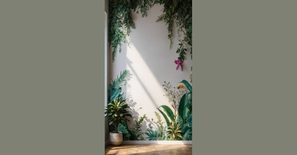 This isn’t just about pretty pictures; it’s about tricking your brain into thinking you’ve suddenly upgraded your space to a secret garden lair. Picture hosting a gaming night or just chilling with friends in a room that feels this fresh – it’s way cooler than plain old beige. Plus, with that awesome sunbeam hitting it just right, the room feels super bright and alive. If your room could use a serious glow-up but you’re not exactly a plant whisperer, this kind of artistic wallpaper is basically your personal cheat code to bringing the outdoors indoors, no green thumb required.