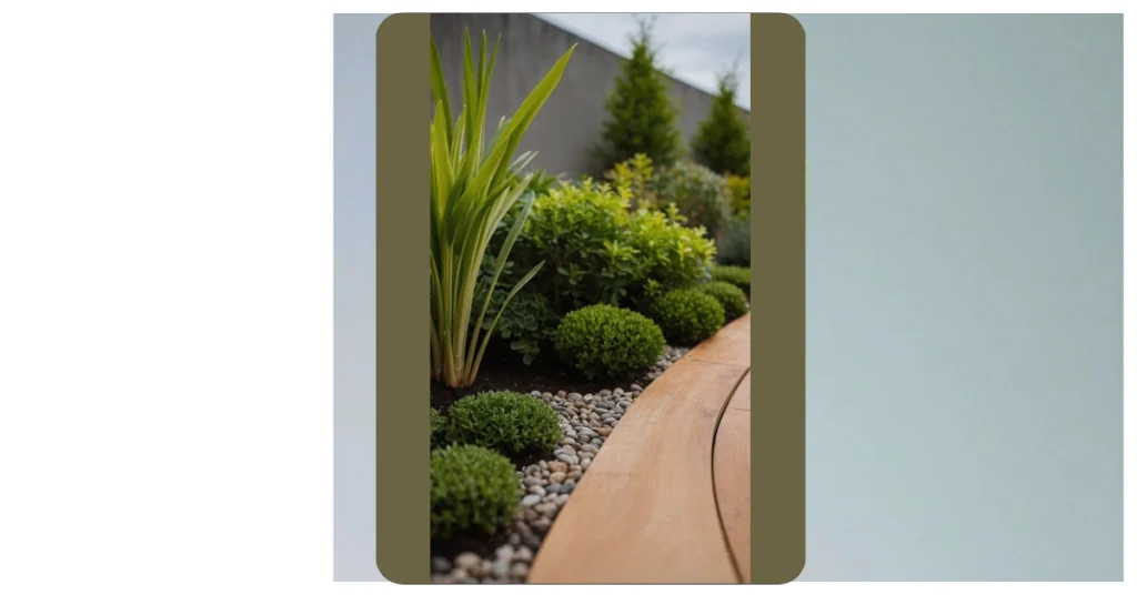 This isn’t just a pretty picture; it’s a strategy! A minimalist front yard like this means less time wrestling with rogue weeds and more time chilling. That smooth, curvy wooden edge isn’t just for looks; it’s practically drawing a line in the sand saying, ‘Neatness starts here!’ Plus, those tall, spiky plants standing guard in the back? They’re definitely making sure everything stays perfectly in place, probably whispering ‘Shhh!’ to any adventurous blade of grass that thinks it can grow out of line.