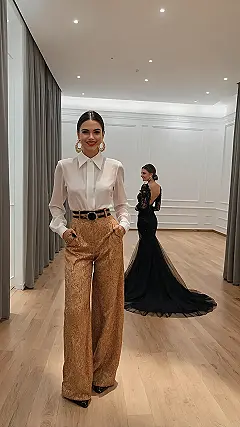 When it comes to holiday parties, picking an outfit can feel like choosing between being super comfy or looking like you just stepped off a runway. Take a look at our main style guru here, rocking those fabulous gold patterned pants and a crisp white shirt. She’s basically saying, “Yeah, I’m fancy, but I also want to eat all the appetizers and still be able to bust a move without tripping over anything.” Her look is perfect for dazzling everyone with chic confidence while still having pockets for your phone (or, let’s be real, emergency candy canes for later). It’s the ultimate ‘I look put-together but can still challenge anyone to a dance-off’ vibe.